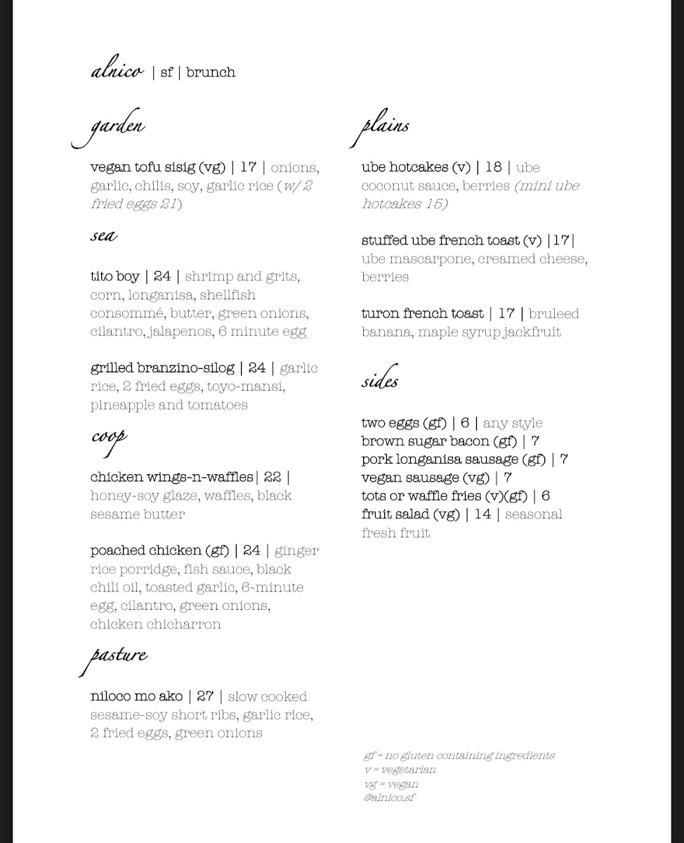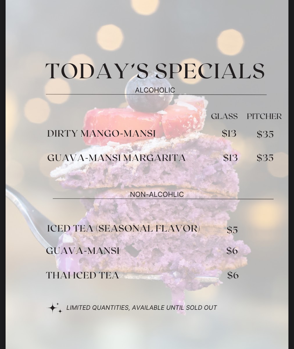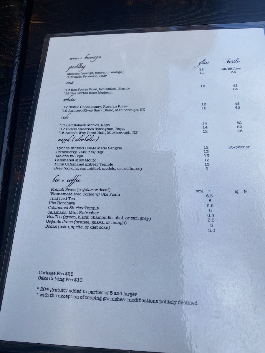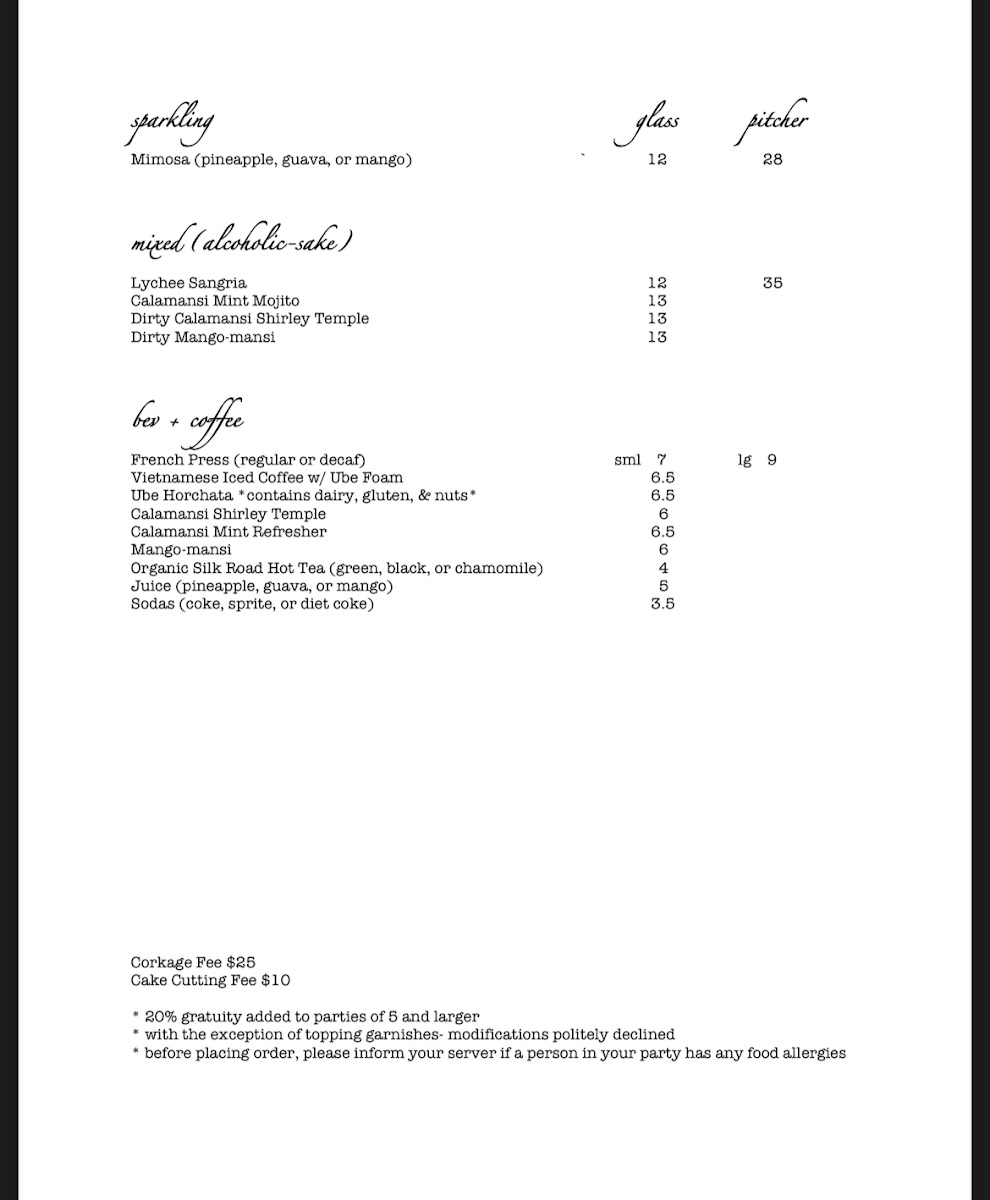 - Beverages and Coffee: The menu offers various coffee and non-coffee beverages including French press coffee, Vietnamese iced coffee with ube, Thai iced tea, ube horchata, Calamansi Shirley Temple, and hot tea.