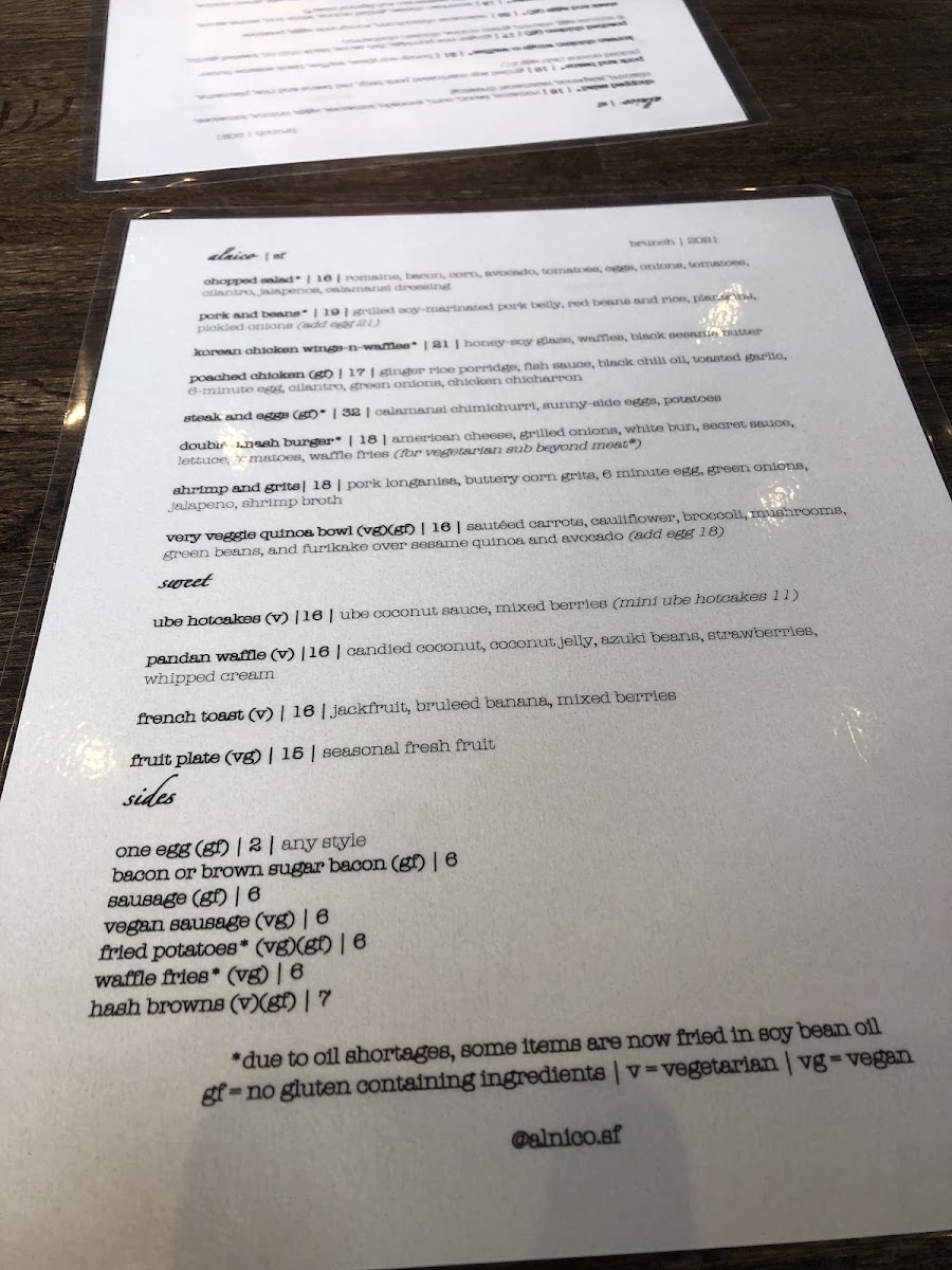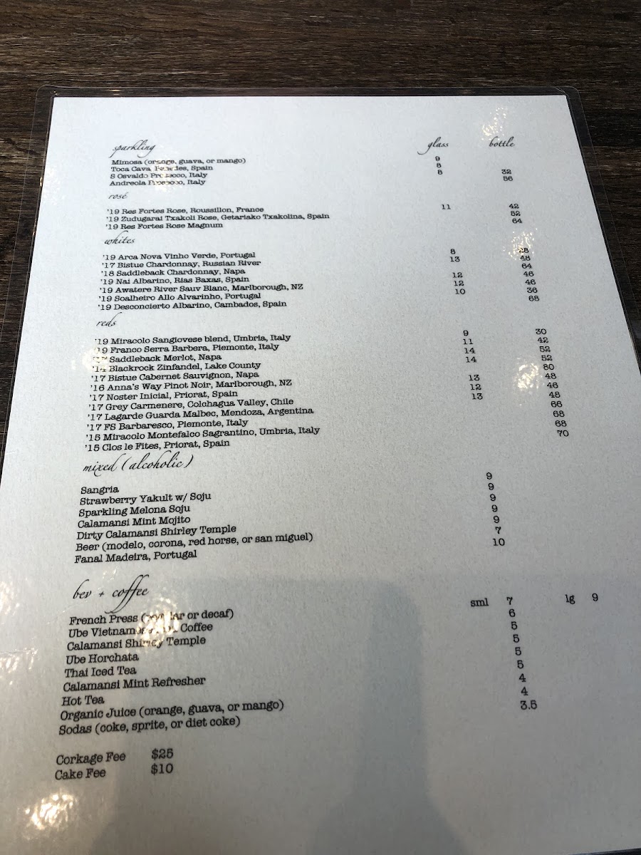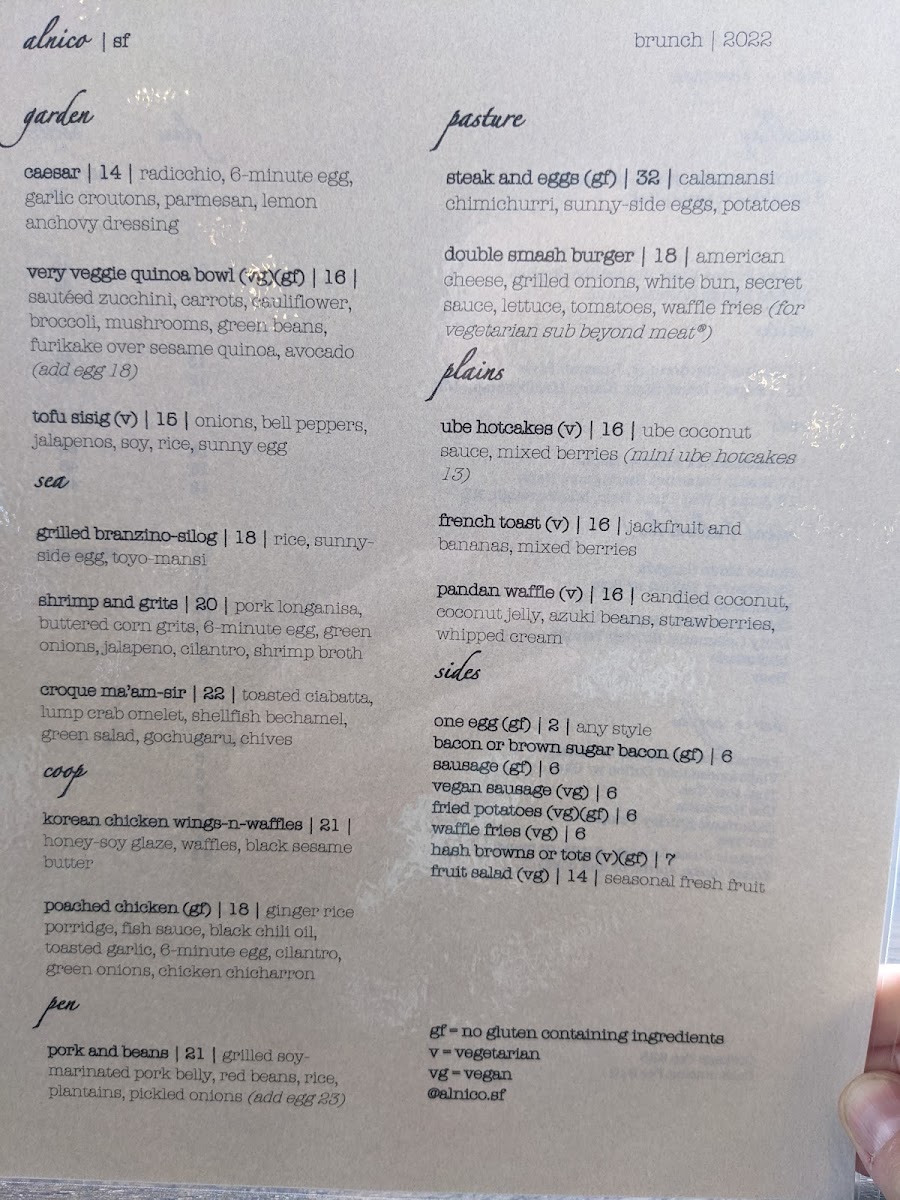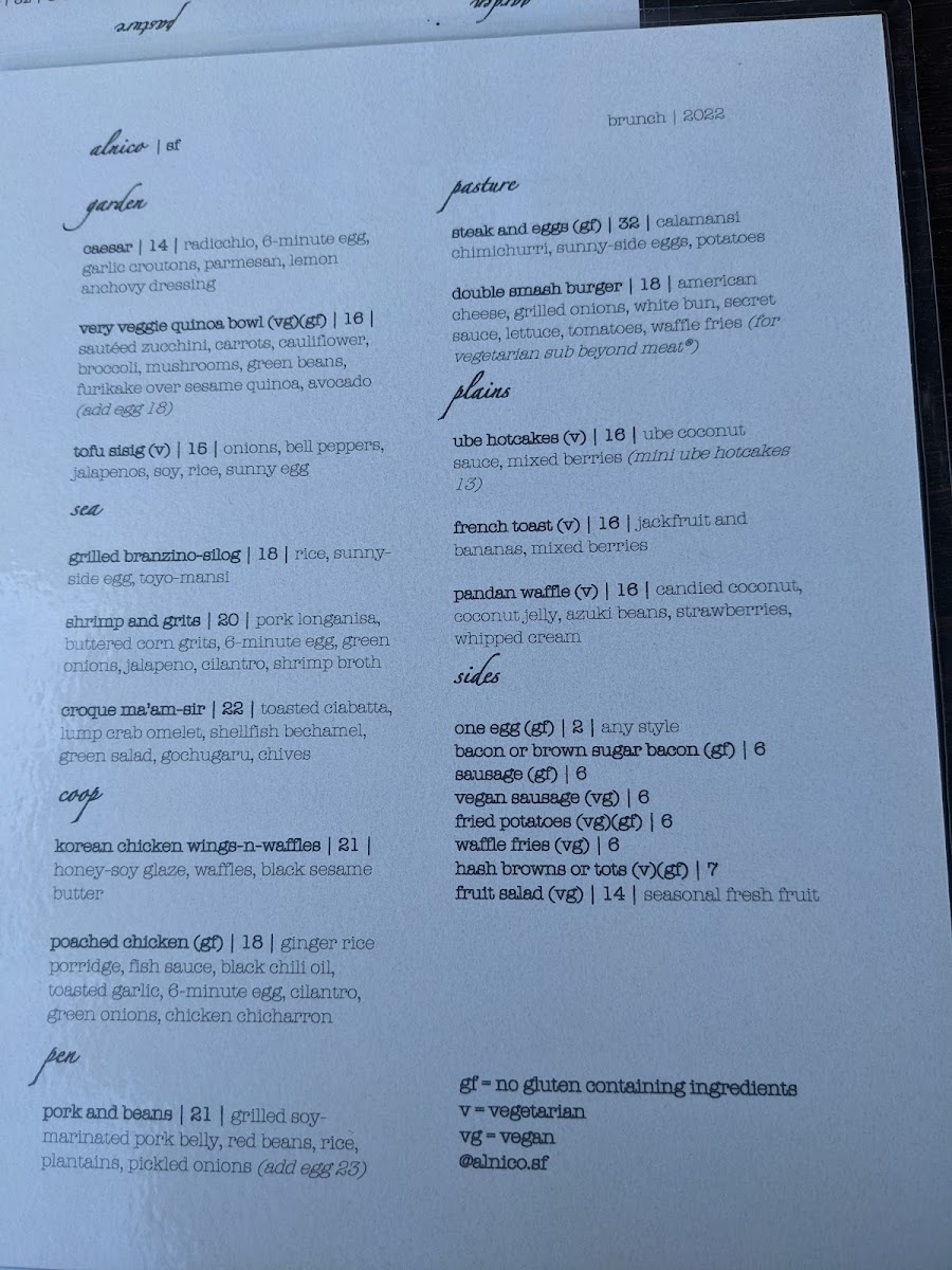 - Beverages and Coffee: The menu offers various coffee and non-coffee beverages including French press coffee, Vietnamese iced coffee with ube, Thai iced tea, ube horchata, Calamansi Shirley Temple, and hot tea.